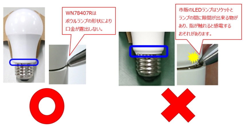 WN78407Rは口金部の形状がソケットとの隙間ができにくい形状をしており、口金部に指が触れて感電するおそれが無いため。