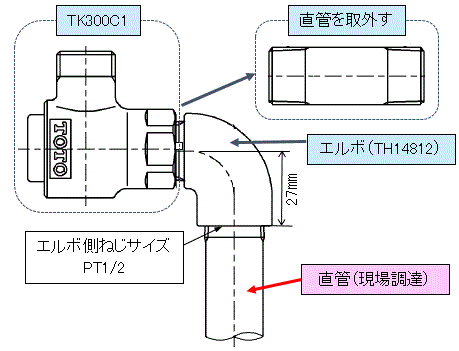 直管の長さは現場のキャビネット内の空間などにより異なるため、現場の空間寸法をご確認の上、現場調達ください。